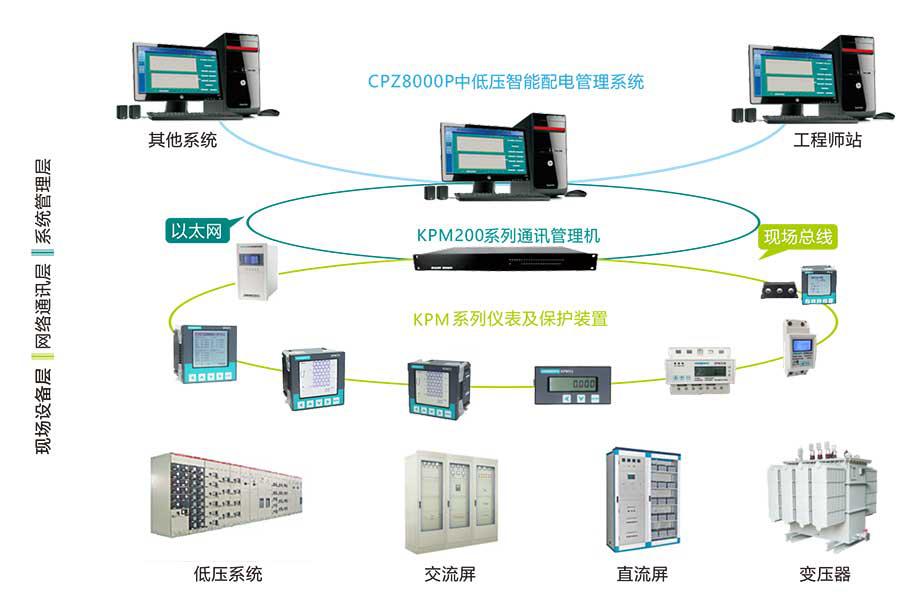 CPZ8000P中低壓智能配電管理系統(tǒng)采用分層、分布式結構設計,按間隔單元劃分、模塊化設計,整個系統(tǒng)分為三層:系統(tǒng)管理層、網(wǎng)絡通訊層、現(xiàn)場設備層。
