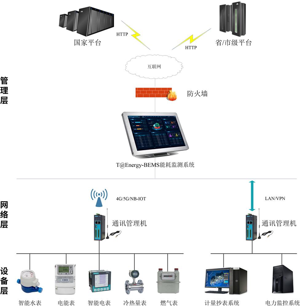 管理層:從網絡上可分為內網和外網兩部分。內網部分用于接收下屬通訊管理機上傳的基礎能耗數據,并將基礎能耗數據進行處理、存儲、分析、展示給能源管理人員,能耗管理工作站用于查看能耗管理服務器分析后的能耗數據,并對數據和信息進行基礎管理。外網部分主要是建筑的能耗數據進行匯總、整理、打包、加密后通過互聯網將數據上報至上一級能耗管理平臺。