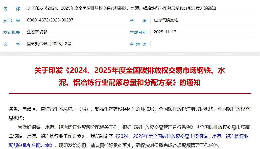 為加快建成更加有效、更有活力、更具國際影響力的碳市場,助力實現(xiàn)碳達峰碳中和目標,生態(tài)環(huán)境部于近日出臺《2024、2025年度全國碳排放權交易市場鋼鐵、水泥、鋁冶煉行業(yè)配額總量和分配方案》,對2024、2025年度配額分配范圍和方法、配額發(fā)放、配額清繳、配額結轉等各項工作進行了安排部署。
